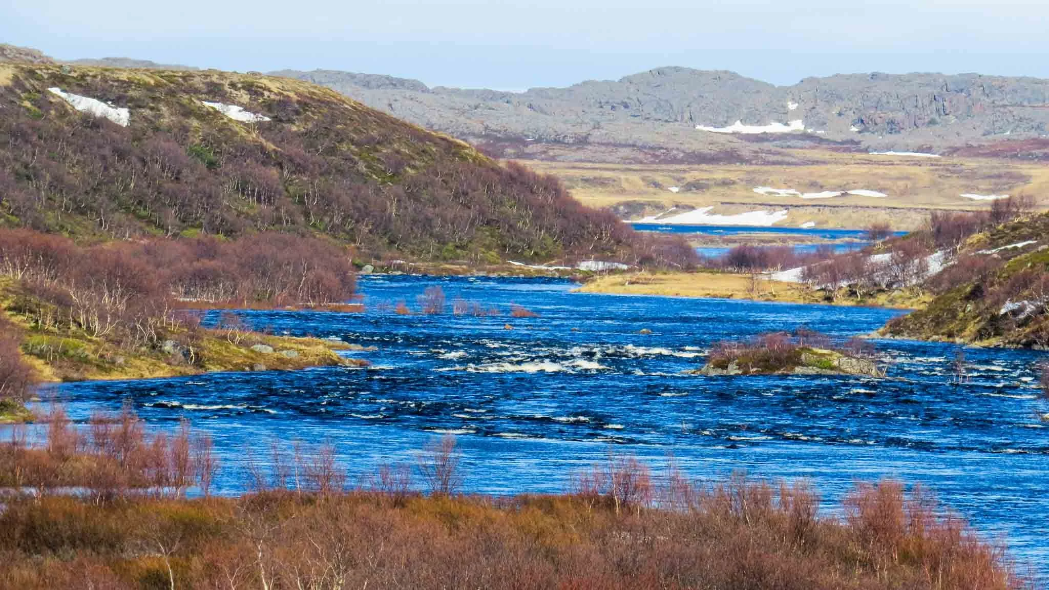 Spring on the Kola Peninsula is cold and late. The ice disappeared from the river two weeks later than usual. There is still a lot of snow along the banks. The water level is very high. Water temperature +3C.